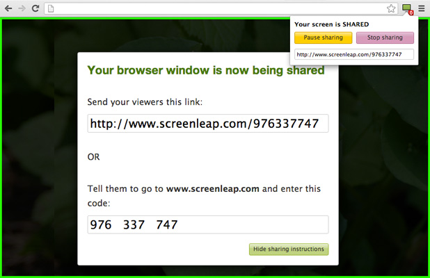You can control your browser share from the console. To open the console, click on the Screenleap extension button. From the console, you can pause and stop sharing. You can also click the link button to the left of the pause button to view the sharing instructions again.